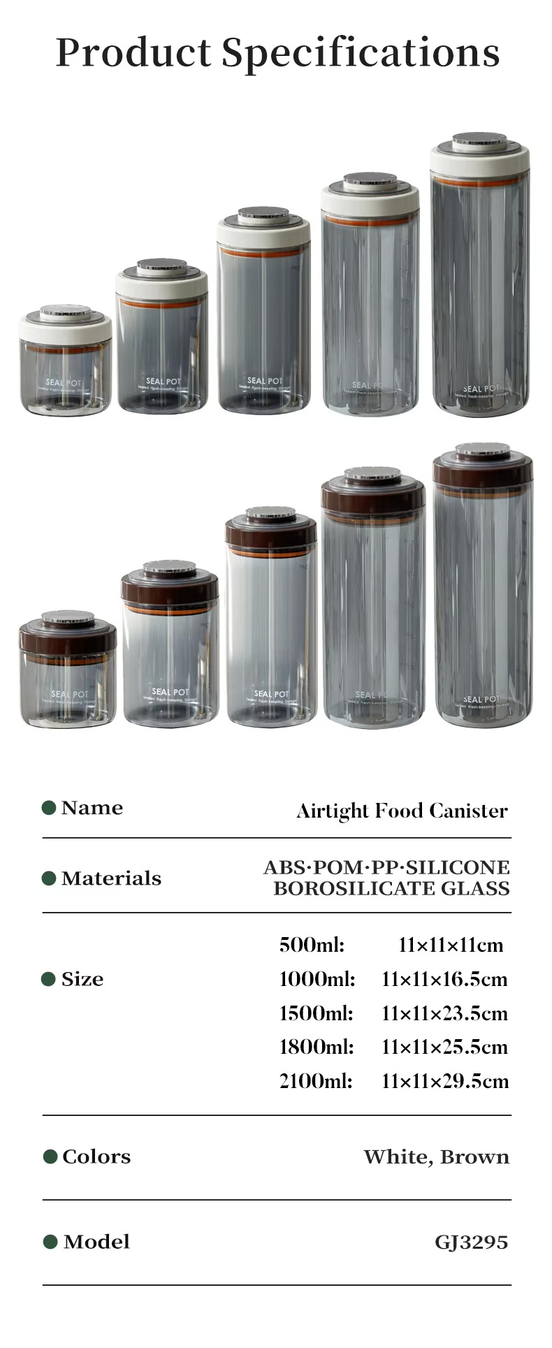 Product Size: 11*11*11cm(500ml/11*11*16.5cm(1000ml)/11*11*23.5cm(1500ml)/11*11*25.5cm(1800ml)/11*11*29.5cm(2100ml)